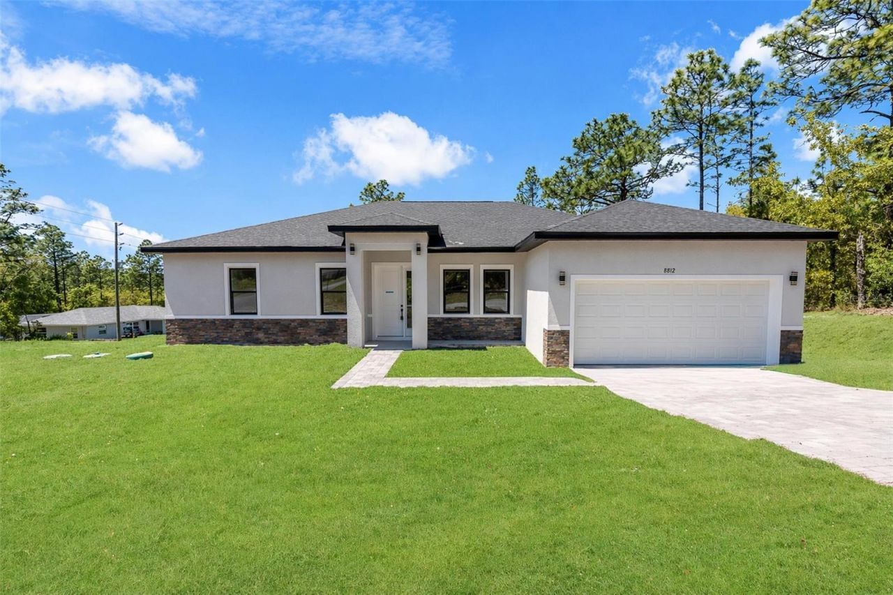 One or more photo(s) has been virtually staged. Elevation and Sophistication in Citrus Springs: Upgraded New Construction on a Prime Corner Lot!Welcome to a new standard of living in Citrus Springs! This stunning, just-completed 4-bedroom, 3-bath home isn't just a new build; it's a statement. Commandingly positioned on a spacious, elevated corner lot, this property offers both a prominent presence and a wonderfully airy perspective that sets it apart.From the moment you arrive, the modern curb appeal is undeniable, featuring elegant stacked stone accents and high-impact dark-framed windows. The wide, brick-paved driveway leads you toward an entrance that feels both private and welcoming.Inside, the home unfolds with a breathtaking open-concept floor plan designed for seamless living and effortless entertaining. High ceilings amplify the sense of space, while the large windows in the family room flood the interior with natural light, blurring the line between inside and out. Durable, sleek plank flooring flows throughout, perfectly complementing the contemporary aesthetic.The heart of this home is the magazine-worthy kitchen. Alabaster-toned shaker cabinets with modern matte-dark hardware and stunning quartz countertops create a clean, refined backdrop. This upgraded space features top-tier stainless steel appliances (refrigerator included!), a built-in microwave, a flat-top range, and a dishwasher. The oversized central island, featuring a waterfall edge and stylish pendant lighting, is perfectly situated to host gatherings and overlooks the main family area.The split bedroom plan offers maximum privacy. The luxurious owner's suite is a true retreat. The upgraded master bath features beautiful, large-format gray marble-style tiles on the floor and in the zero-entry shower with a modern rain head and built-in niche. The spa-like experience is completed by a stunning, freestanding soaking tub with a floor-mounted faucet. A convenient second suite-perfect for guest privacy or versatile living-and two additional bright, comfortable bedrooms ensure plenty of space for everyone.Embrace the beautiful Florida weather from your large covered back patio, accessible via sliding glass doors from the main living area. Ideally located near natural springs, world-class trails, and the Gulf Coast, this property offers the perfect balance of luxury and outdoor recreation.Don't settle for ordinary. Experience the elevation, upgrades, and location of 8812 N Lansen Way. Schedule your showing today!